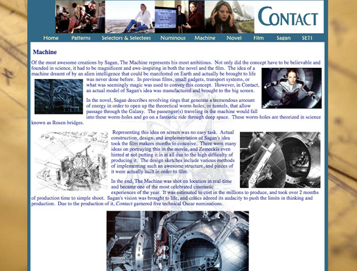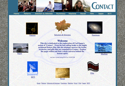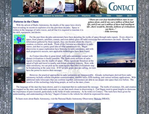 Inspired by Carl Sagan's Contact, this website was one of my first forays into web design. I developed the content and layout for this site in a New Media course one semester. Back then, web pages were built using tables, font tags, and hand-coded HTML. While technologies have changed, and my design skills have advanced, the Contact website still holds a special place for me. I believe a lot of my design aesthetic has foundations in this website. The multi-layered backgrounds, image styles, and perspective all can be seen in more creative and advanced ways in some of my newer work. However, I think the Contact website gave me a solid beginning based on the technology at the time. If anything, it taught me value of hand-coded HTML. Carl Sagan's work continues to influence me, and I would love to revisit this website in the future to have a more interactive presentation. |
