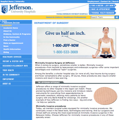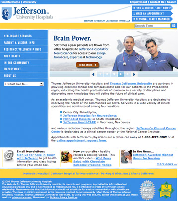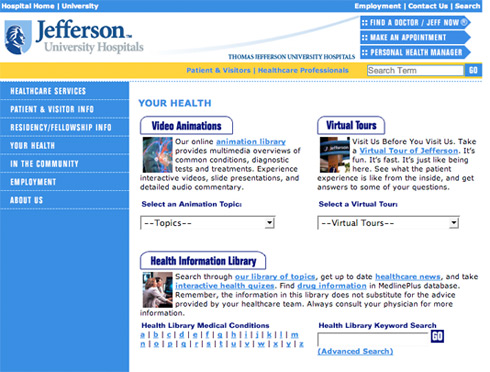 The main Jefferson Hospital website is multi-layered with many components acting simultaneously reaching multiple audiences. The site spans over 40,000 pages of content that incorporates Jefferson's main branding, key product lines, health information libraries, press releases, media libraries, doctor databases, and approximately fifty department websites. It generates over ten million hits monthly with over one million unique visitors. The idea of the website is present one front-facing portal to varied audiences and to be a resource for the healthcare community. Each piece has to be well-maintained in order to unify to one seamless experience. Due to it's stature, the website is template driven and is built using a Content Management System (CMS). I was the main administrator for the site, creating/updating content, managing design, training departments to use the CMS, and interfacing with IS to ensure consistency. |