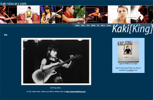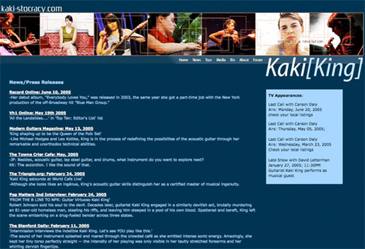 A good friend of mine were emailing one day back and forth, sharing our tales of east vs. west coasts, and she mentioned she ran into Kaki King at one of those LA fusion places. They struck up a conversation, became friendly, and the next thing I know, I'm designing a site inspired by Kaki's immense musical talent. I am still fond of the blue I used for this website, and the box elements helped me explore perspective. I've used a few of these techniques in later designs. I'm still a huge fan of Kaki King, and I've gotten word from my friend that she has seen (and loved) the site. |