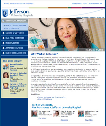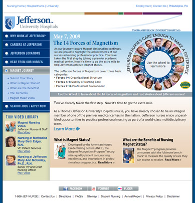 The award-winning Jefferson Nursing website was developed with one thought in mind: attract the best and brightest nurses to Jefferson. All the elements on the website reflect Jefferson's dedication to Nursing, and it was designed with the same attention and care . We strived to create an interactive site that showcased Jefferson's nursing talent via videos, Facebook events, ease of use, and clean visuals. One area of the website, the Magnet Journey, was designed in conjuction with Jefferson's efforts to achieve Magnet Recognition - the highest Nursing honor. The micro-site was developed in Flash with user interaction being key. The nursing staff was asked to submit their stories to represent their amazing efforts. Jefferson achieved Magnet Recognition, and I designed the site to reflect the hard work of the entire Nursing staff - the videos, the stories, and the visuals are all showcases to their achievements. The website is a 2008 e-Healthcare winner for Best Recruitment site. |