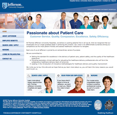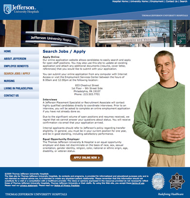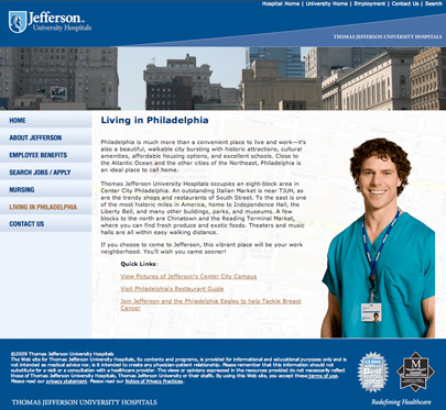 The Jefferson Hospital Recruitment site was created when Jefferson implemented its online applicant tracking system. The Recruitment site is the front-facing introduction to Jefferson Hospital for all potential applicants. The website tracks over 30,000 hits monthly. It was also the first site to implement Jefferson's new branding. I developed the site from a four page word document that only contained the website copy. I based the site off the new branding guidelines and added as much visual interest and "friendliness" to the site as possible. The design was a hit, and I went on to develop similar sites for Jefferson based on this design template. The site received a Distinction Award for the Best Employee Recruitment site for the 2009 eHealthcare Leadership Awards. |