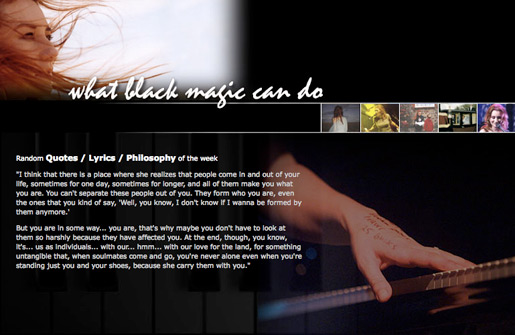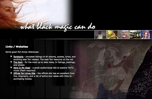 With a spur of inspiration from Tori Amos, I built this site one afternoon. She had a new album rapidly approaching, and my excitement was palpable. I decided to do some research on some of her older tracks, and this site was born from a few simple images and quotes. I just tried to keep the design simple, yet inspired. I used a few shots I took from one of her Philadelphia concerts. I loved the idea of using maps, words, and lyrics, and those ideas have continued to inspire me in other projects. |